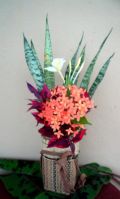 heliconia latispatha. Such strong showing of colours I thought need to be smoothen and given interest. Therefore I added a few blooms of the